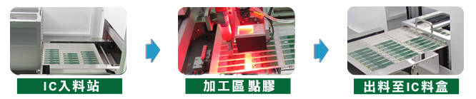 - 3. 點膠作業(yè)完成後,自動將板材送出退料區(qū)。